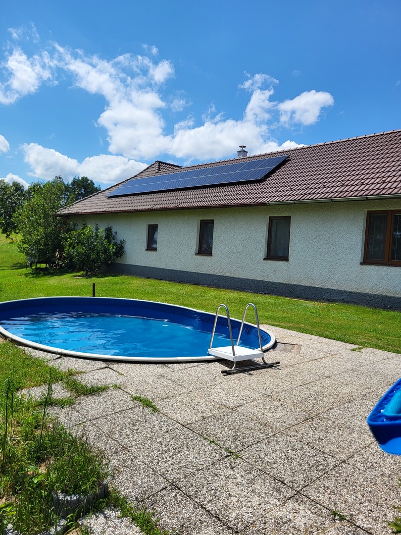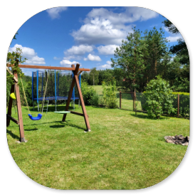ohništěm, grilem, trampolínou, houpačkami a zapuštěným bazénem.